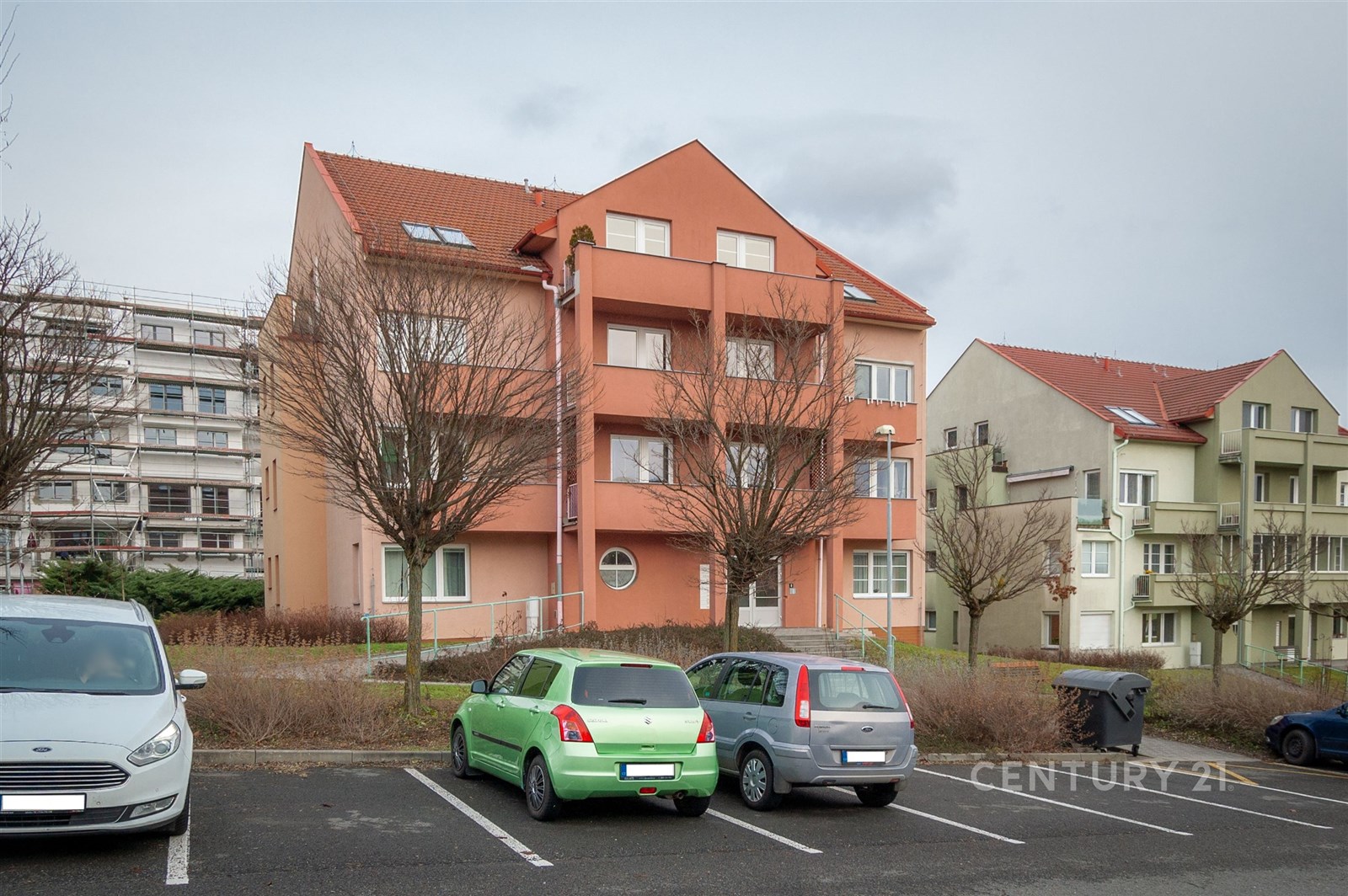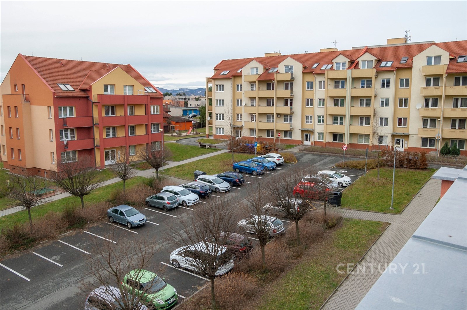 Fotografie 15/17 Výhled z balkonu na klidnou rezidenční čtvrť s rodinnými domy a parkovacími místy, okolní zeleň a kopcovitá krajina v pozadí, prostorné parkoviště.
