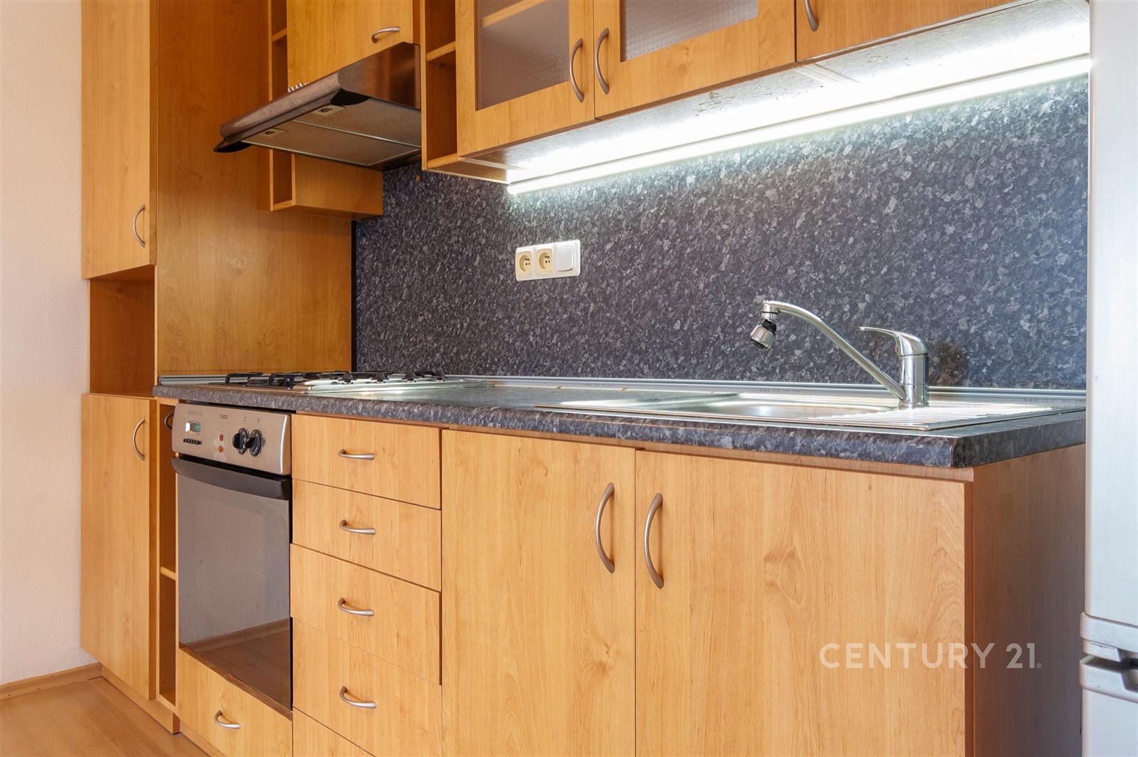 Fotografie 5/17 Kuchyňský kout s parketovou podlahou, moderní spotřebiče, dřevěné skříňky a vestavěná kuchyňská linka v světlém bytě.